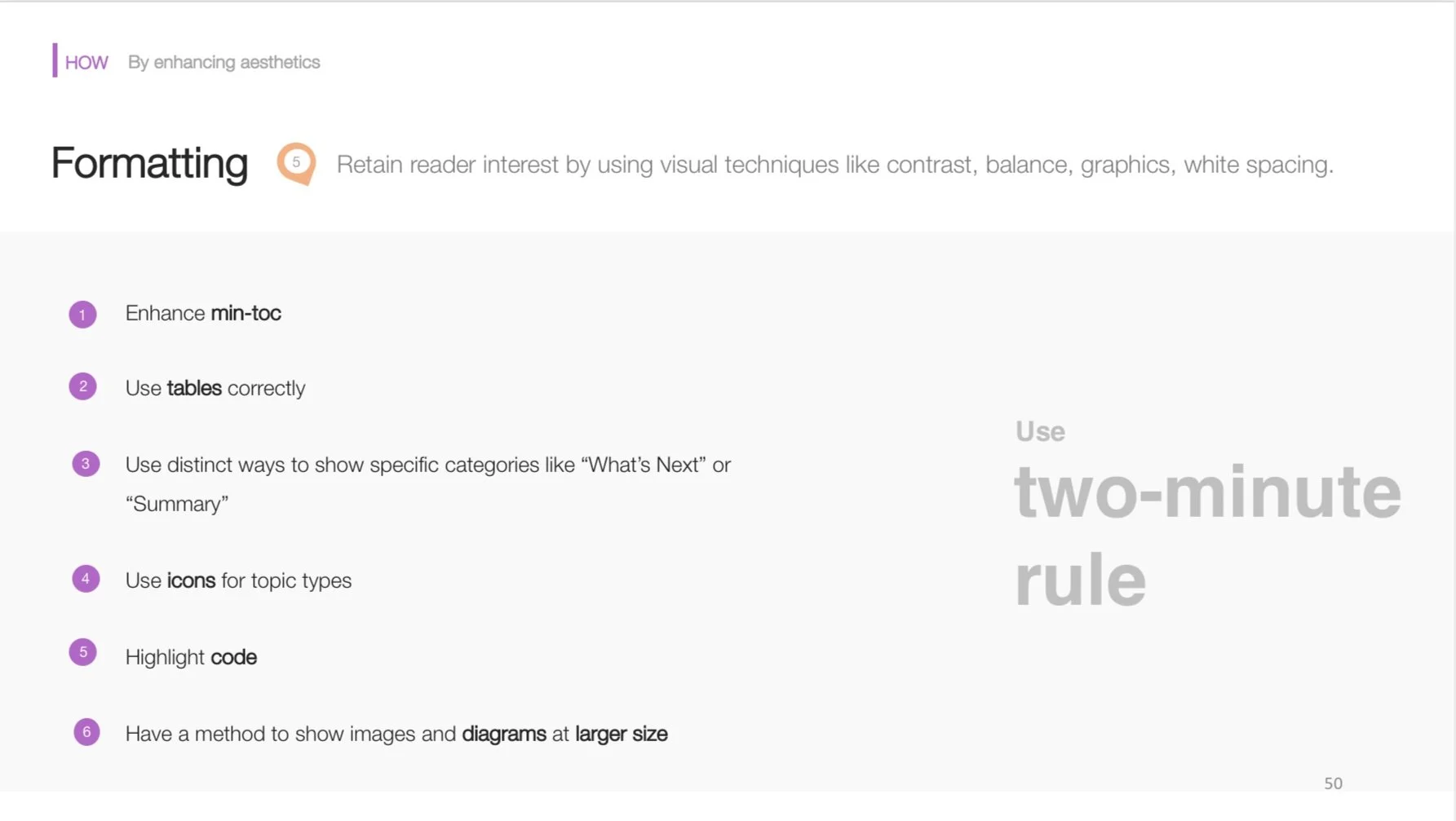 I ran workshops and created templates to simplify documentation through use of personal tone, reduction of text-wall effect, balancing of visual techniques and emphasis on succinct explanations. This effort directly impacted how content was approached by 50+ technical writers.